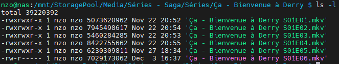 Lorsque j’ajoute un film ou un épisode de série sur mon NAS via FileBrowser, comme vous pouvez le voir sur l’image, un problème se pose : le fichier ajouté n’a pas les bons droits. Résultat, lorsque j’actualise mes bibliothèques dans Jellyfin, celui-ci ne détecte pas les nouveaux contenus, ce qui m’empêche évidemment de les regarder.