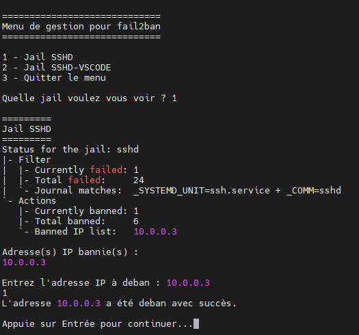 Ce script génère un menu, comme les deux précédents, et me demande de quelle jail je souhaite consulter le statut. Une fois mon choix effectué, s’il y a des IP bannies, le script me permet de les débannir. En revanche, s’il n’y a aucune adresse bannie, il poursuit simplement son exécution jusqu’à sa condition de fin.