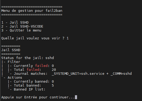 echo "Menu de gestion pour fail2ban"