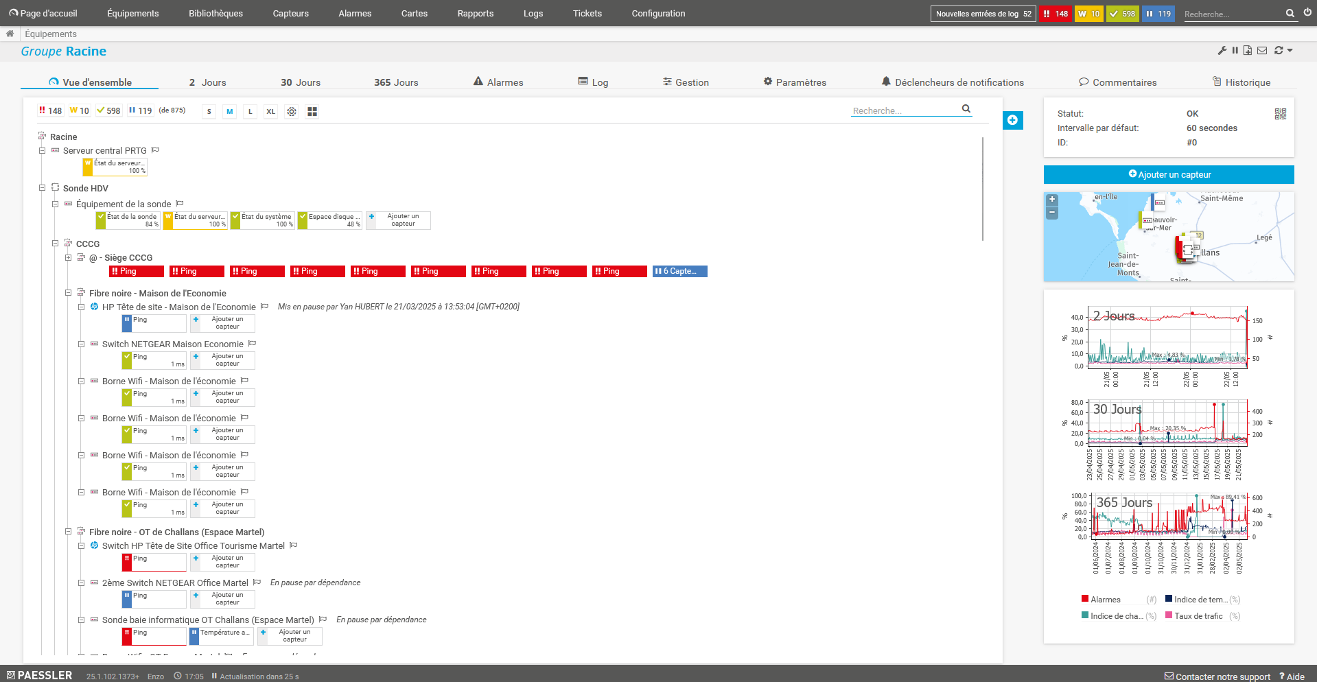 J'ai également appris à utiliser le logiciel PRTG, qui permet de superviser le matériel en détail avec des sondes de température, de charge CPU, et de cartographier les équipements sur une carte de la ville.