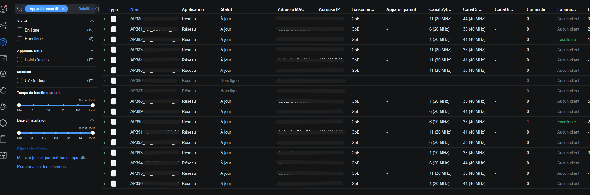 Cette nouvelle infrastructure contient 4 switchs Cisco (pour 4 sites distincts) et 17 bornes Unifi U7 outdoor, pour le lab que j'ai mis en place, je n'ai qu'un