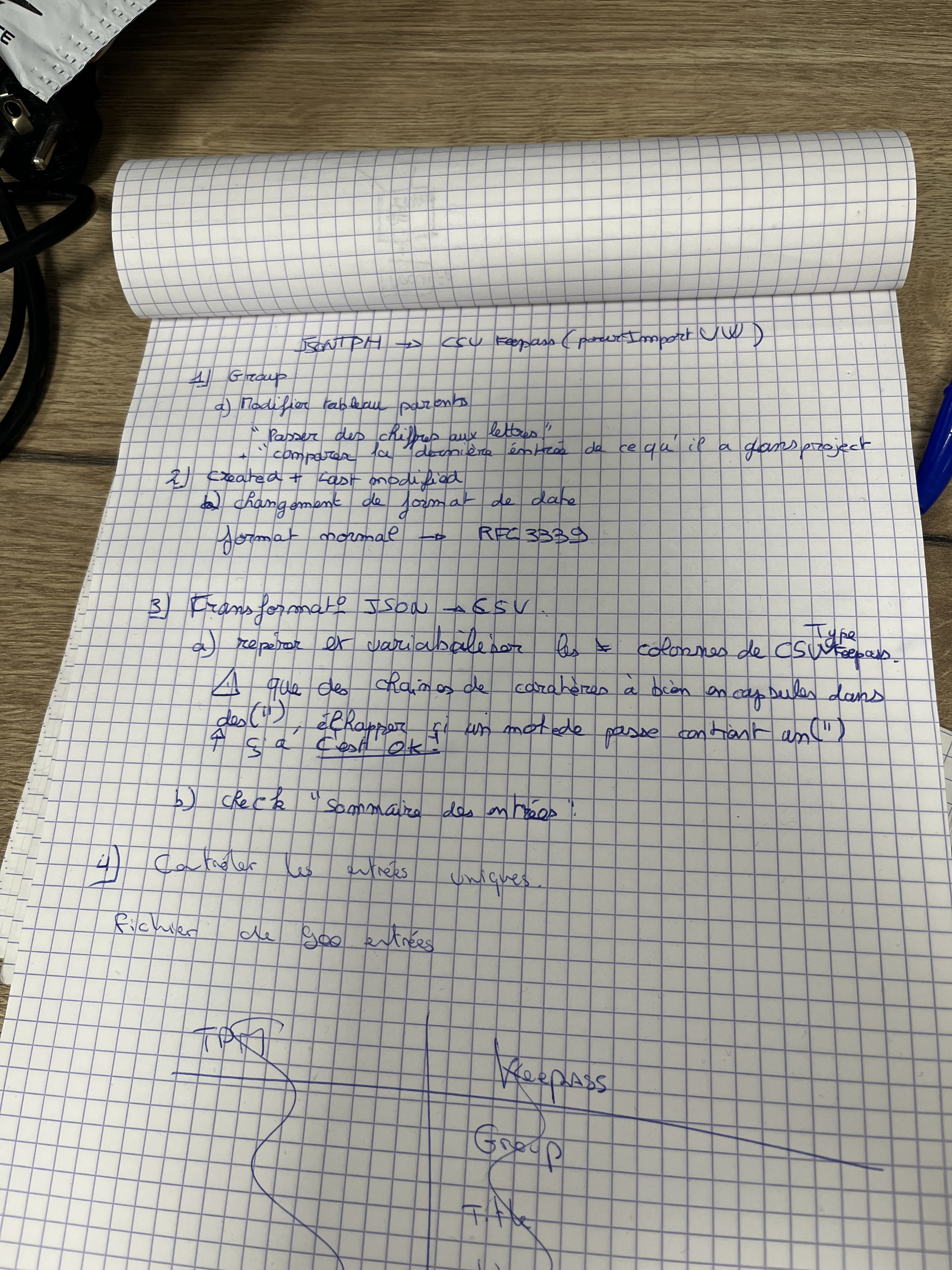 Au début de ma deuxième semaine, j'ai essayé d'importer un CSV de test qui venait de KeePassXC et ça marchait il fallait donc que je trouve un moyen de convertir les json que je récuperais de l'API en CSV compatible KeePassXC. J'ai donc fais une checklist des modifications que devait faire le script avec le json.