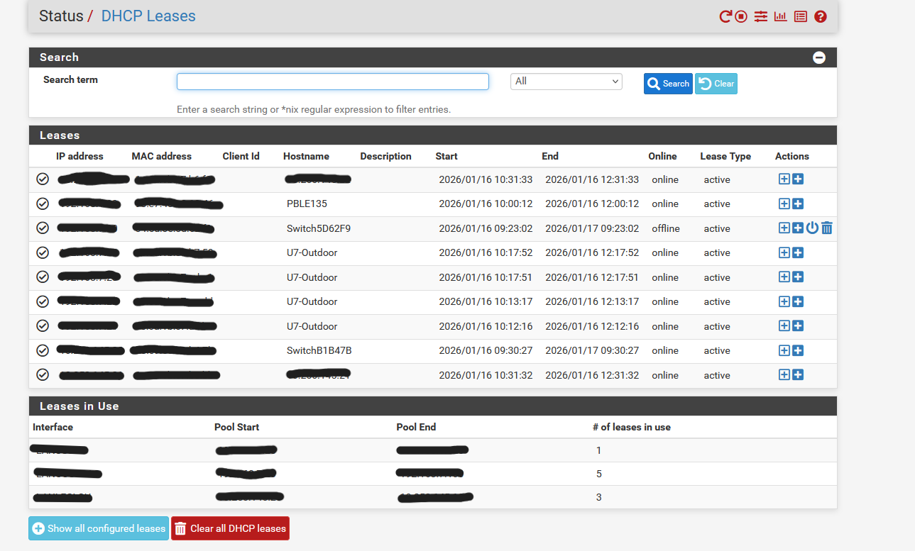 Le contrôleur Unifi étant une machine virtuelle, les bornes devaient toutes remontées sur le contrôleur, les plus faciles étaient celles du premier site car elles sont dans le même réseau que le pare-feu mais ensuite, celles qui étaient dans les autres réseux je devais me connecter en SSH et faire une commande spécifique pour envoyer une invitation au contrôleur pour que qu'il adopte la borne. Je récupère les adresses IP des bornes dans les bails DHCP que distribue le pfSense.