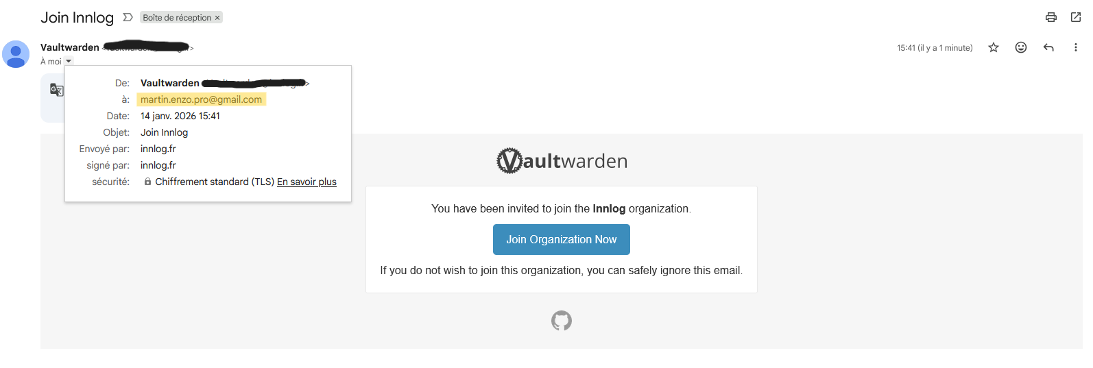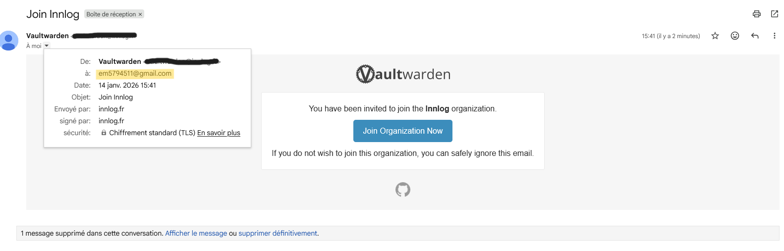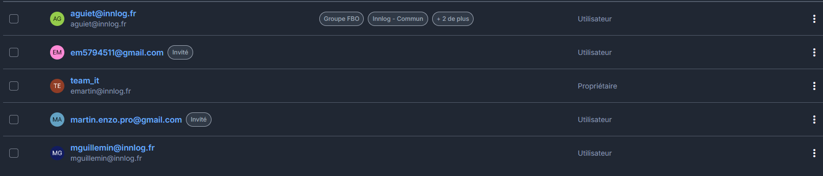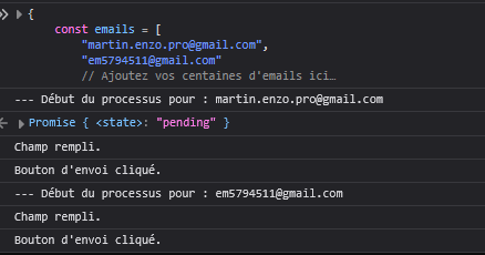 Pour inviter des personnes à utiliser le coffre Innlog il faut les inviter par mails encore une fois un par un, il a donc fallu automatisé ça aussi. Au début j'ai pensé à concaténer plusieurs adresses mails avec des séparateurs comme {} ou , mais ça ne marchait pas. Après ça, j'ai donner à une IA, l'attributs html qui servait à ouvrir un fenêtre modal en JavaScript et l'attribut du bouton "Envoyer" et avec ça j'ai eu un morceau de code JavaScript à balancer dans la console en faisant F12 qui automatisait l'envoie de mail à toutes les adresses mails présentes dans le tableau du morceau de code. Et j'ai essayé avec deux adresses mails qui m'appartiennent pour tester.