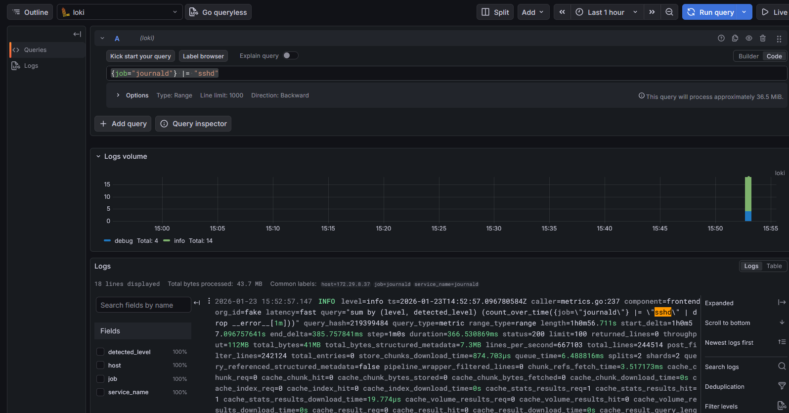 Enfin, il fallait trouver les bons LogQL pour bien parser les logs SSH pour que ce soit plus lisible et faire remonter les informations que l'on veut, une sorte de filtre.