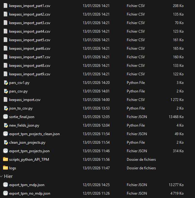 Lors de mon arrivée chez Innlog, j'ai dû m'approprier rapidement leurs outils internes. L'entreprise utilisait historiquement TPM comme gestionnaire de mots de passe, mais le service IT avait décidé de migrer vers Vaultwarden, une alternative Open Source conçue en Rust. Pour ça j'ai expérimenté deux solutions, exportation de fichiers CSV, l'API de TPM. J'ai passé beaucoup de temps sur la solution des fichiers CSV car TPM n'exporte qu'en CSV. Le coffre fort TPM qu'utilise Innlog contient 6500 entrées qui sont reparties dans plusieurs projets et pour exporter il faut télécharger tous les projets un par un à la main. J'ai donc du automatisé ce processus avec la librairie Python Playwright qui simule un comportement humain sur un site web et qui faisait donc la manipulation d'exportation à ma place. Avec cette technique j'avançais plutôt bien dans le téléchargement des centaines de fichiers CSV mais le script ne marchait plus à partir du moment ou il trouvait un projet qui a le même nom qu'un précédent même si il se trouve dans une autre branche de projets. À partir de ce moment la je me suis penché sur l'API de TPM pour pouvoir tout récuperer beaucoup plus rapidement et ne pas dépendre d'un script python qui fait des manipulations mais d'un script python qui exécute une commande en boucle jusqu'à la fin des entrées de mots de passe ce qui est plus fiable.