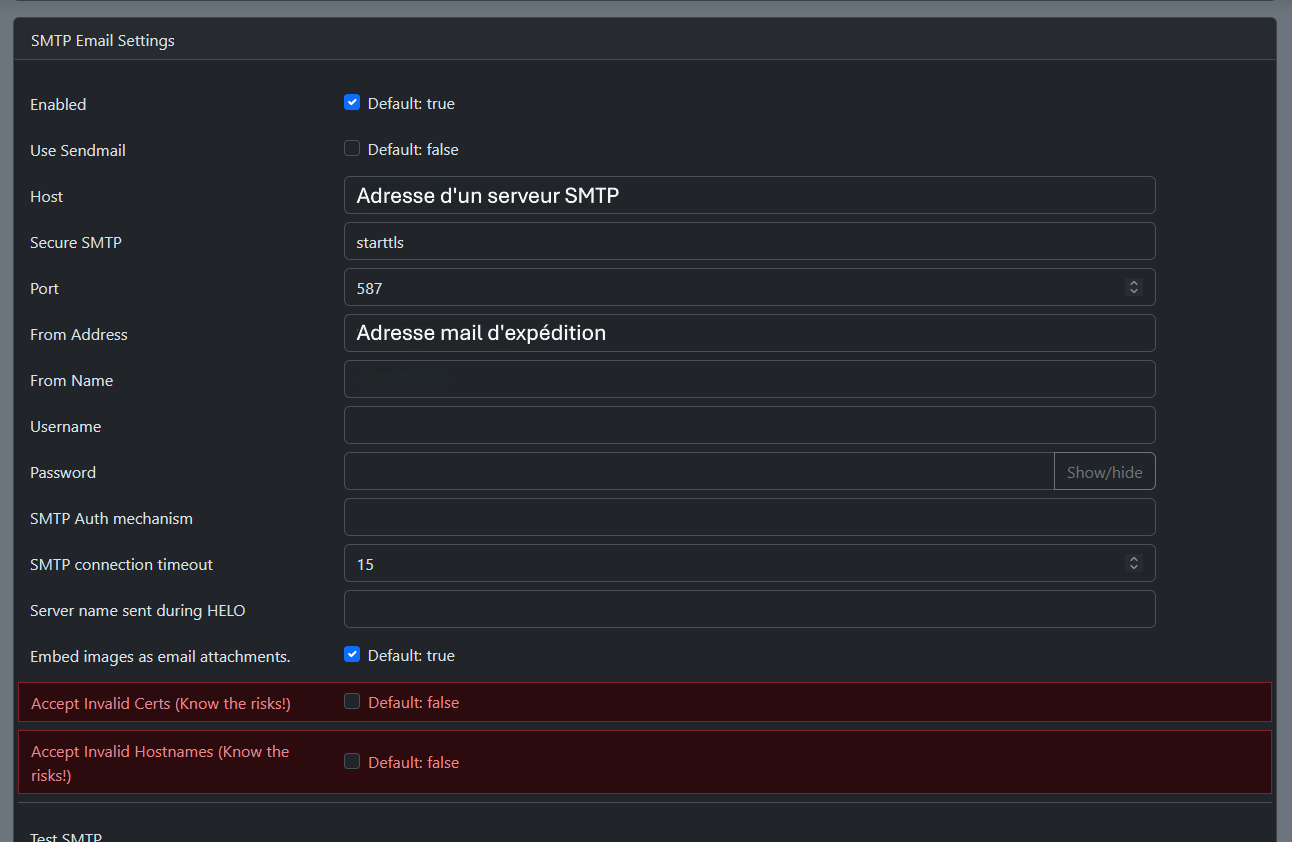 Il fallait aussi configurer un serveur SMTP sur Vaultwarden