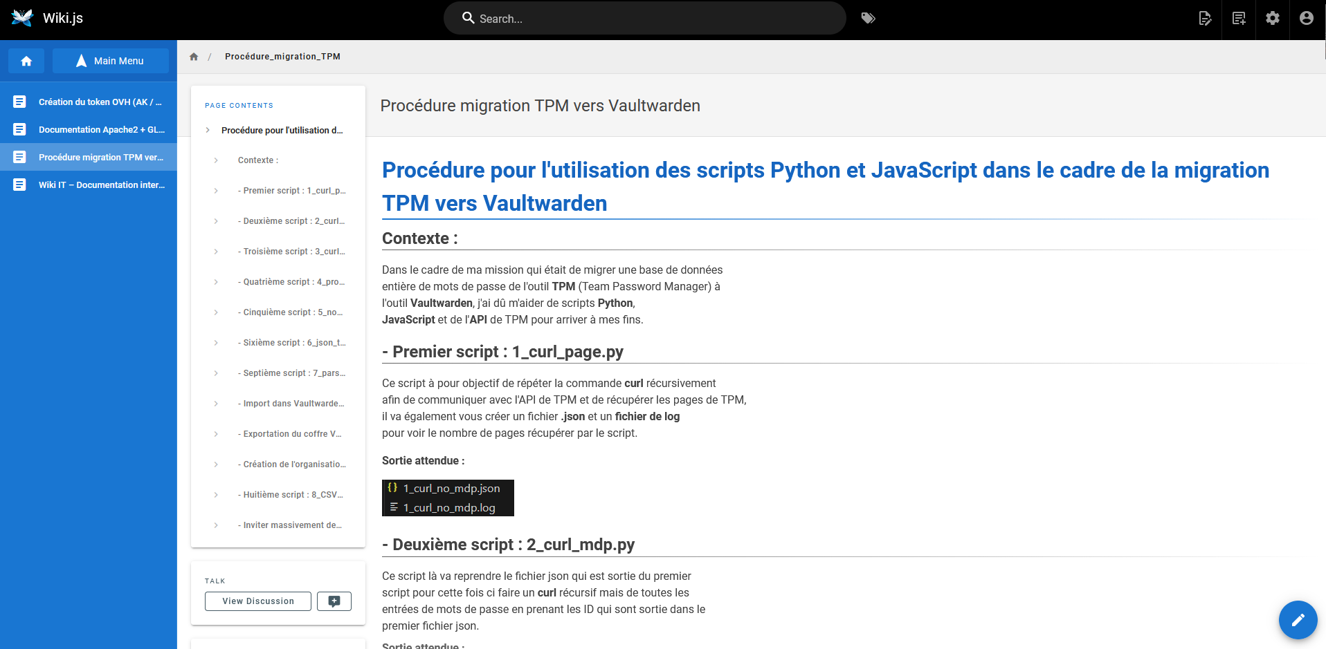 Ensuite j'ai décidé de faire une documentation sur l'utilisation des scripts Python et JavaScript pour la migration des mots de passe de TPM vers Vaultwarden. En interne Innlog possède un WikiJS qui est un projet Open Source qui peut être auto-hébergé et qui sert à stocké des documentation pour l'ensemble du service sous forme de .md (markdown)