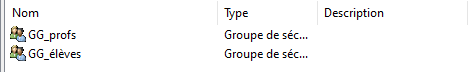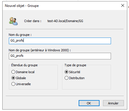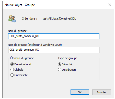 Une fois les UO créées, vous pouvez commencer à créer les GG et les GDL. Les groupes globaux sont des groupes dans lesquels on placera les utilisateurs, et ces groupes globaux seront ensuite intégrés dans les groupes de domaine local. Pour les GDL, on essaie de respecter une convention de nommage GDL_nom de la ressource_permission.