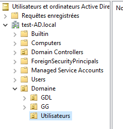 Pour la gestion des habilitations sur les dossiers partagés, nous devons créer des UO (Unités d’Organisation), des GG (Groupes Globaux) et des GDL (Groupes de Domaine Local). Dans l’application Utilisateurs et ordinateurs Active Directory, vous pouvez créer des UO afin d’organiser votre hiérarchie.