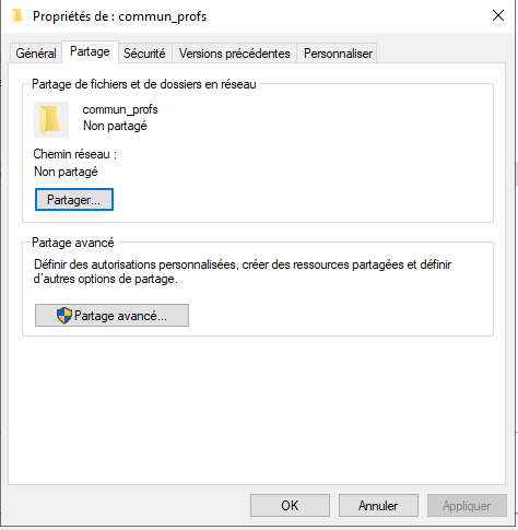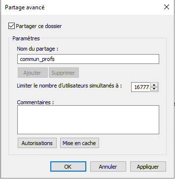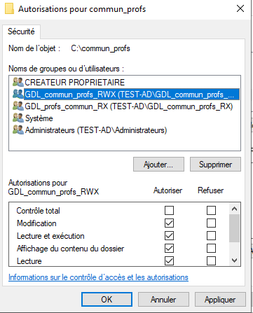 Sur cet exemple je ne montre que les permissions sur le dossier commun_profs mais c'est le même principe sur le dossier commun_eleves.
