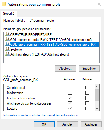 Comme vu précédemment, nous partirons du principe que les élèves auront les droits de lecture et d’exécution sur le dossier commun élèves, mais qu’ils n’auront aucun droit de modification sur les autres dossiers. Les professeurs, quant à eux, disposeront des droits de lecture et de modification sur l’ensemble des dossiers. Évidemment, il s’agit ici de permissions données à titre d’exemple : dans un cas réel, il faudrait être beaucoup plus rigoureux dans leur définition. Cet exemple a uniquement pour but d’illustrer le principe de la méthode AGDLP.