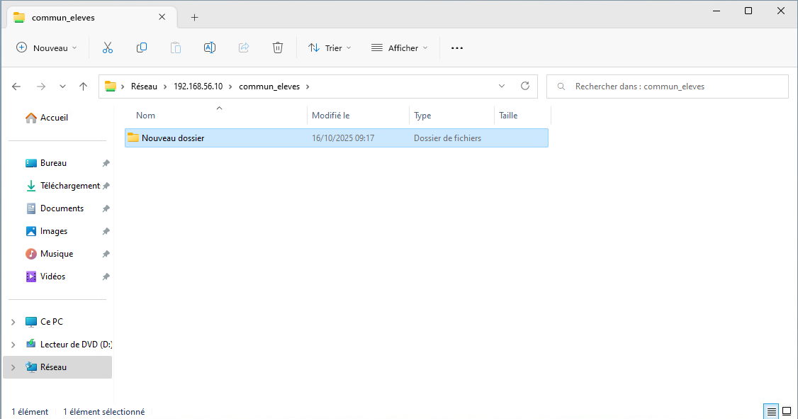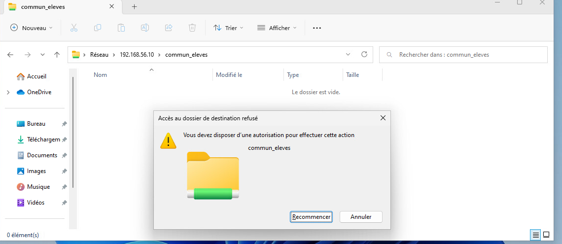 Ici, on voit bien que les permissions ont été prises en compte, car je ne peux pas créer de dossier ni de fichier dans le dossier commun_élèves.