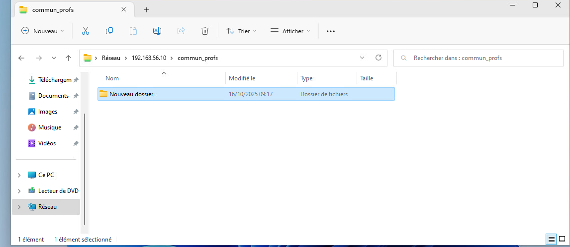 La méthode fonctionne bien : les professeurs peuvent créer des dossiers et des fichiers dans les deux dossiers présents sur le partage réseau.
